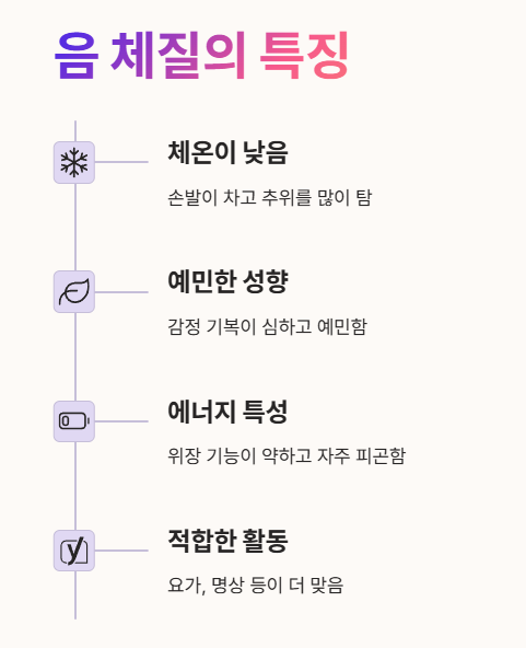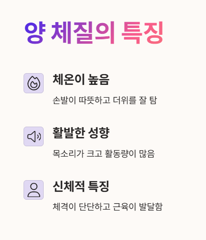 체질의 ‘양’은 에너지가 외부로 잘 드러나는 타입이고, ‘음’은 에너지를 내부로 보존하는 타입으로 이해하시면 쉬워요 😊