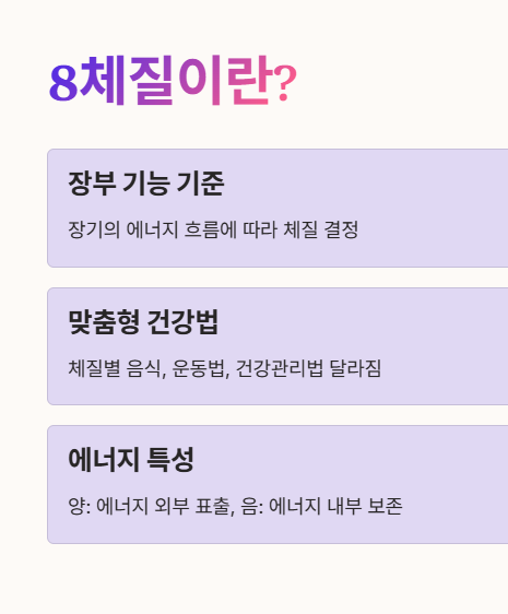 저는 몇 년 전 건강이 안 좋아서 지인의 소개로 처음 8체질이라는 걸 알게 되었는데요. 처음엔 생소하고 어렵게만 느껴졌지만, 막상 알아보니 내 체질에 맞는 음식과 생활 습관을 알 수 있어서 큰 도움이 되었답니다. 👍