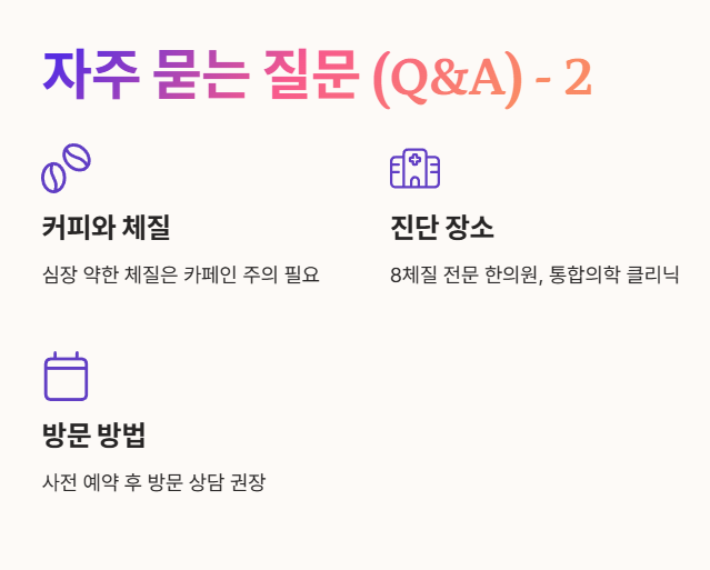 A. 네, 특히 심장이 약한 체질(화음체질 등)은 커피나 카페인 섭취가 심장을 자극할 수 있어 주의가 필요해요.