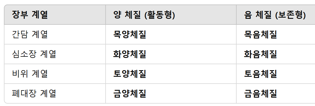 마찬가지로 화 계열 + 양 체질 → 화양체질, 토 계열 + 음 체질 → 토음체질 등으로 세부 구분 가능!