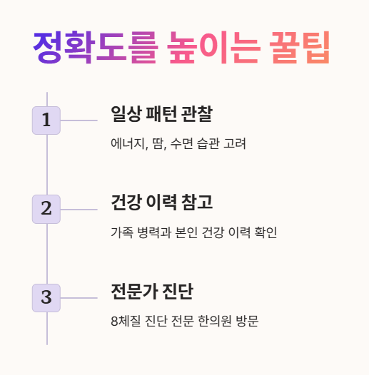 예를 들어, 1단계에서 목 계열로 판단되었고 2단계에서 ‘음 체질’ 항목이 많다면, 목음체질로 예측할 수 있어요.