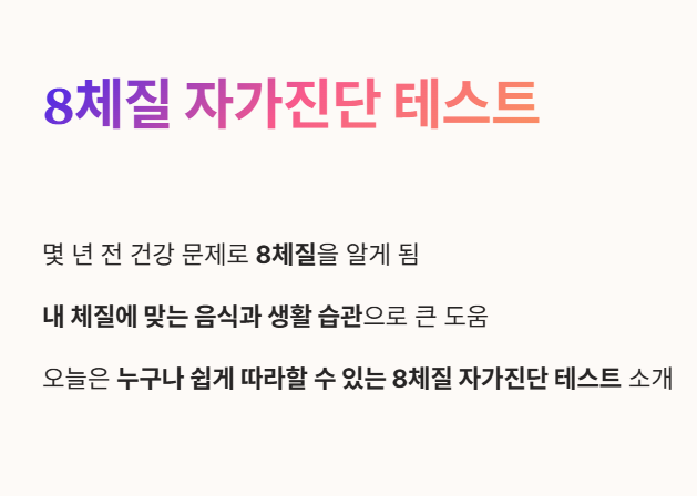 그래서 오늘은 누구나 쉽게 따라할 수 있는 8체질 자가진단 테스트를 소개해드릴게요.
