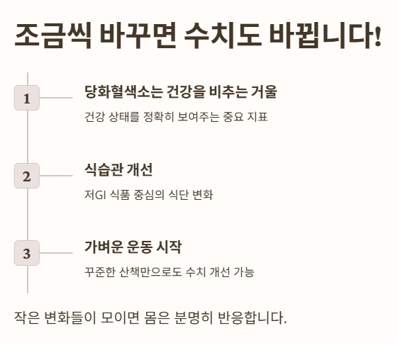 저도 식습관을 바꾸고 가볍게 산책을 시작했는데, 3개월 뒤엔 수치가 5.8%로 내려갔답니다! 😊