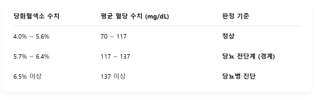당화혈색소 수치에 따라 혈당 조절 상태를 판단할 수 있어요. 아래 표를 참고해보세요.