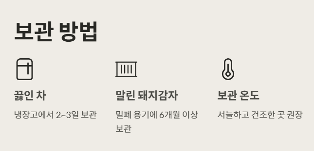- 한 번 끓인 돼지감자차는 냉장고에 보관하면 2~3일 정도 신선하게 마실 수 있어요.