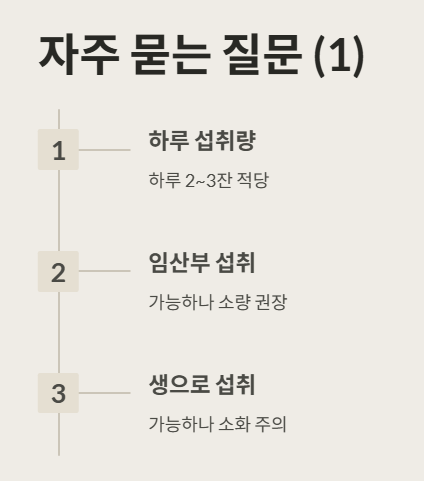 하루 2~3잔 정도가 적당해요. 너무 많이 마시면 소화 불량이 생길 수도 있으니 적당히 섭취하는 게 좋아요.