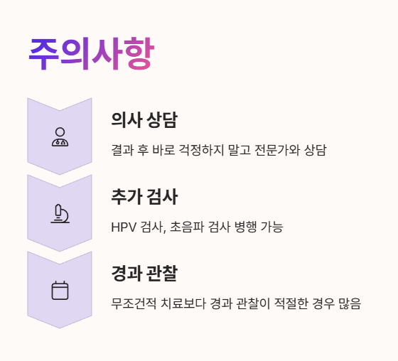 • HPV 검사, 초음파 검사 등 추가 검사가 병행될 수도 있어요.