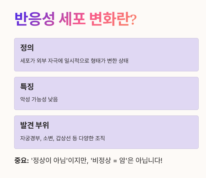 반응성 세포 변화(reactive cellular changes)세포가 외부 자극이나 염증, 호르몬 변화 등으로 일시적으로 형태나 구조가 달라진 상태를 의미해요.