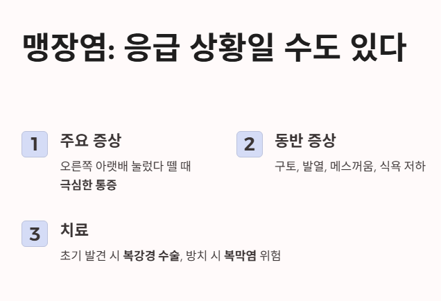 맹장염은 응급 수술이 필요한 질환일 수 있으므로, 증상을 잘 살펴봐야 합니다.