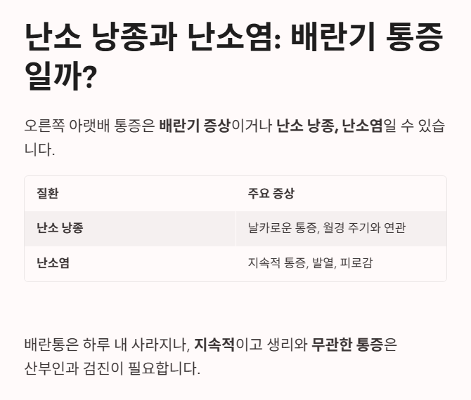 | 난소염 | 지속적인 통증, 발열, 피로감 동반 |