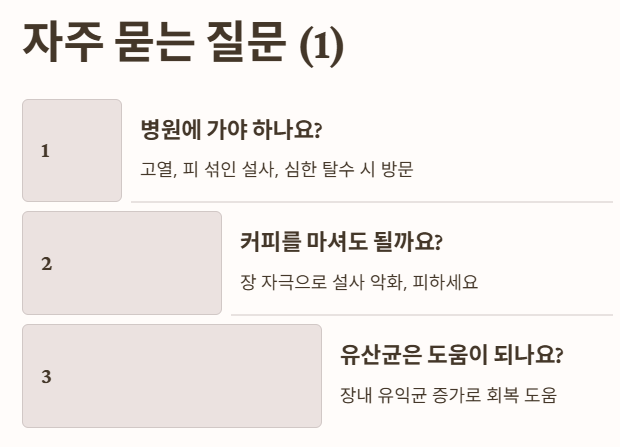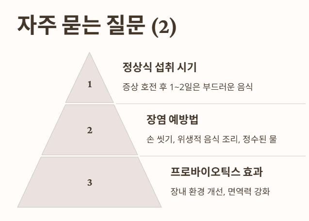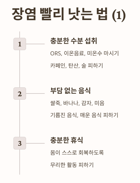 가장 중요한 것은 수분 보충과 위생 관리이며, 장을 보호하는 음식을 섭취하는 것도 필수입니다. 😅