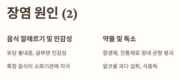 장염은 장내 염증이 발생하는 질환으로, 바이러스, 박테리아, 기생충 감염 또는 음식 알레르기 등 다양한 원인에 의해 발생합니다.
