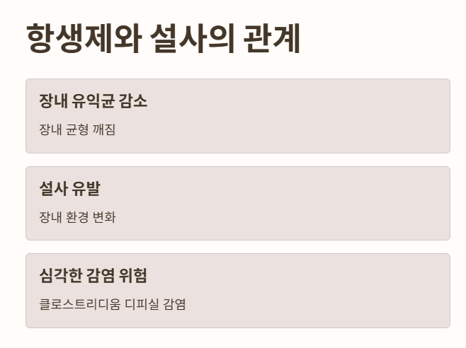 항생제는 세균을 죽이는 역할을 하지만, 동시에 장내 유익균까지 함께 제거할 수 있습니다. 이로 인해 장내 균형이 깨지면서 설사가 발생할 수 있습니다.