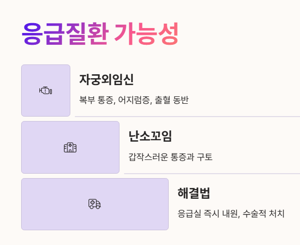 - 자궁 외 임신은 초기에는 가벼운 통증으로 시작하지만, 복부 통증과 함께 어지럼증, 출혈이 있으면 응급 상황이에요.