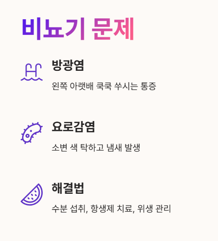 - 방광염이나 요로감염이 생기면 왼쪽 아랫배가 쿡쿡 쑤시고 소변이 자주 마려워요.