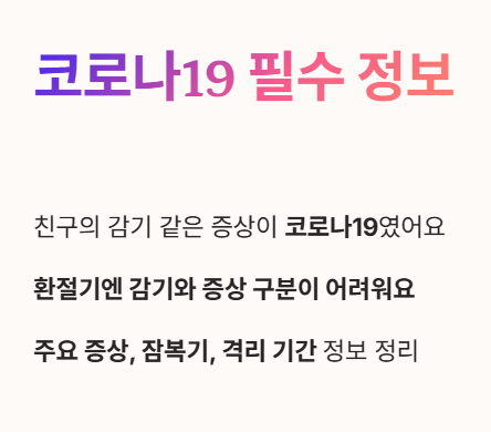 코로나 증상부터 잠복기간, 격리기간까지 한눈에 정리! 감기와 다른 증상 구별법과 자가 대처법까지 쉽게 알려드립니다. 꼭 확인해보세요. 😉